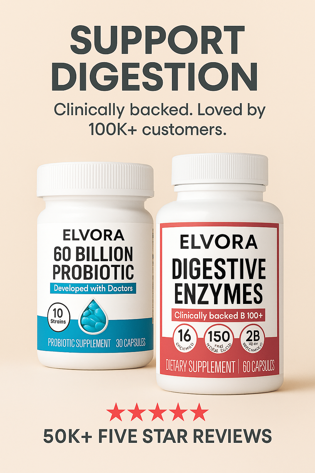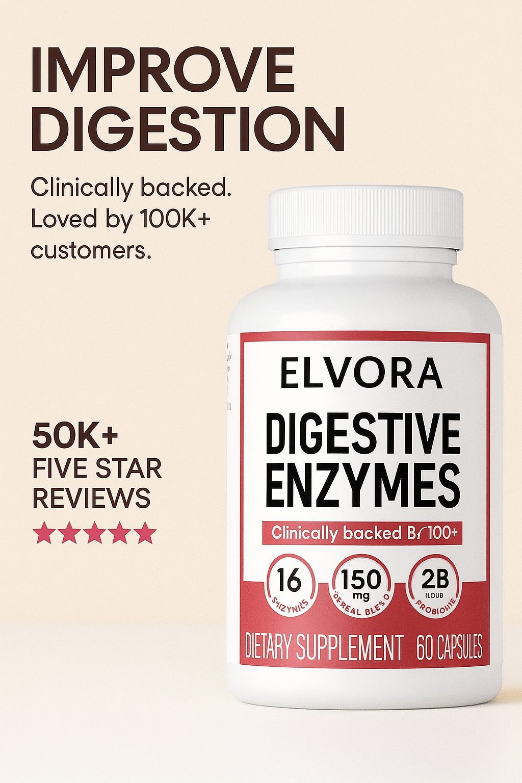 (About 5–10 minutes before your biggest meal, take 1 capsule of Elvora Digestive Enzymes with water.)